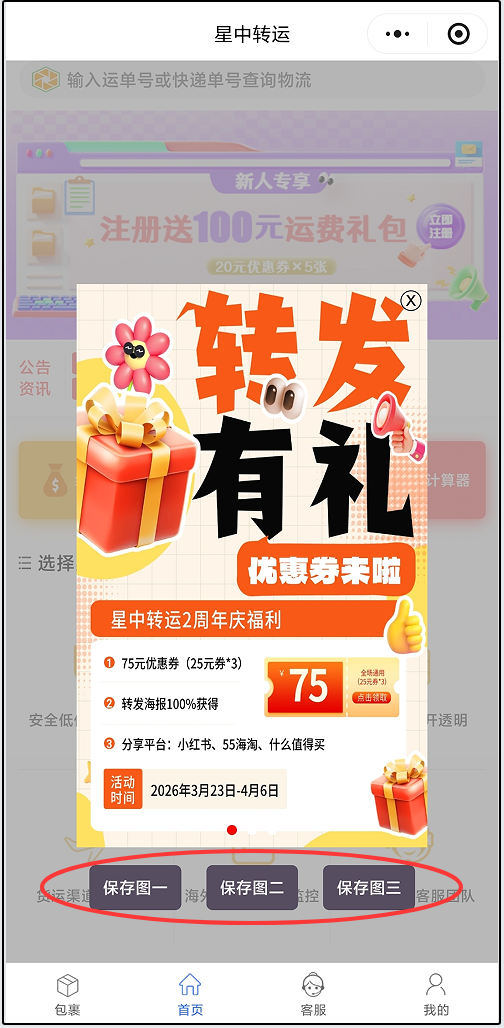 活动内容:活动期间登录星中小程序保存官方海报并分享到【小红书】【55海淘】【什么值得买】,每成功分享1个平台可获得25元优惠券,完成3个指定平台海报分享可累计获得75元优惠券奖励。